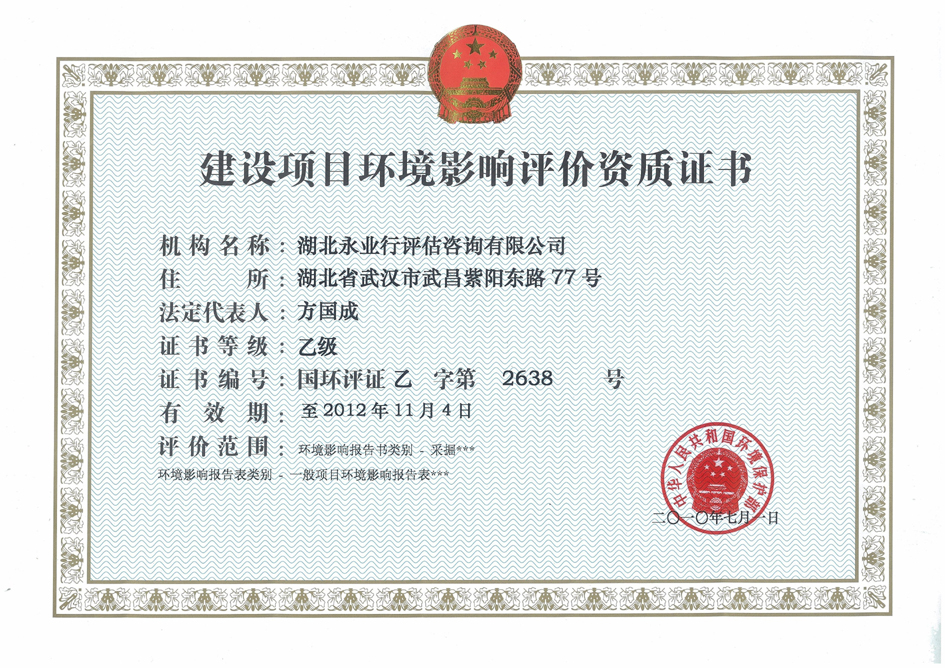 7月1日,國家環(huán)境保護(hù)部下達(dá)了《關(guān)于批準(zhǔn)建設(shè)項(xiàng)目環(huán)境影響評價資質(zhì)(2010年第五批)的公告》,其中,永業(yè)行環(huán)評資質(zhì)經(jīng)批準(zhǔn)增加了采掘類環(huán)境影響報告書評價范圍。
